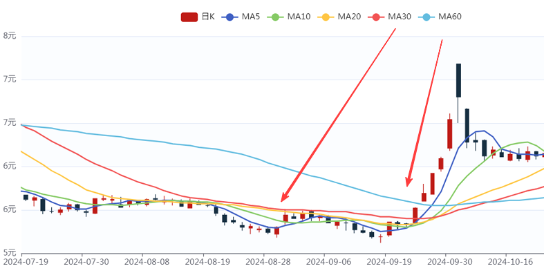 | 5天移动平均股价,同理MA10、MA20、MA30、MA60、MA120、MA240分别指10天、20天、30天、60天、120天、240天移动平均股价。常说的月线指MA20,季线指MA60,年线指MA240。为什么年线是MA240而不是MA360?因为一年的实际交易日约240天。 |